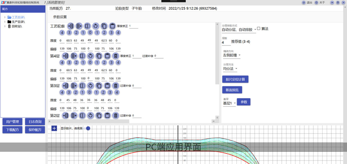 此系統(tǒng)利用非線性數(shù)學(xué)模型線性化的方法,將不規(guī)則的胎面形狀轉(zhuǎn)化成線性圖形,并通過預(yù)覽圖直觀的顯示設(shè)計(jì)結(jié)果,提供多種編輯方式,以便用戶快速調(diào)整達(dá)到預(yù)期效果。此外,系統(tǒng)在多個(gè)項(xiàng)目中積累經(jīng)驗(yàn),成功開發(fā)出自動(dòng)分層功能,支持多種分層算法和膠片定位算法,分層結(jié)果科學(xué)精準(zhǔn)。設(shè)計(jì)結(jié)果可一鍵下發(fā)到生產(chǎn)設(shè)備,實(shí)現(xiàn)控制系統(tǒng)與生產(chǎn)制造裝備的數(shù)字化聯(lián)通。